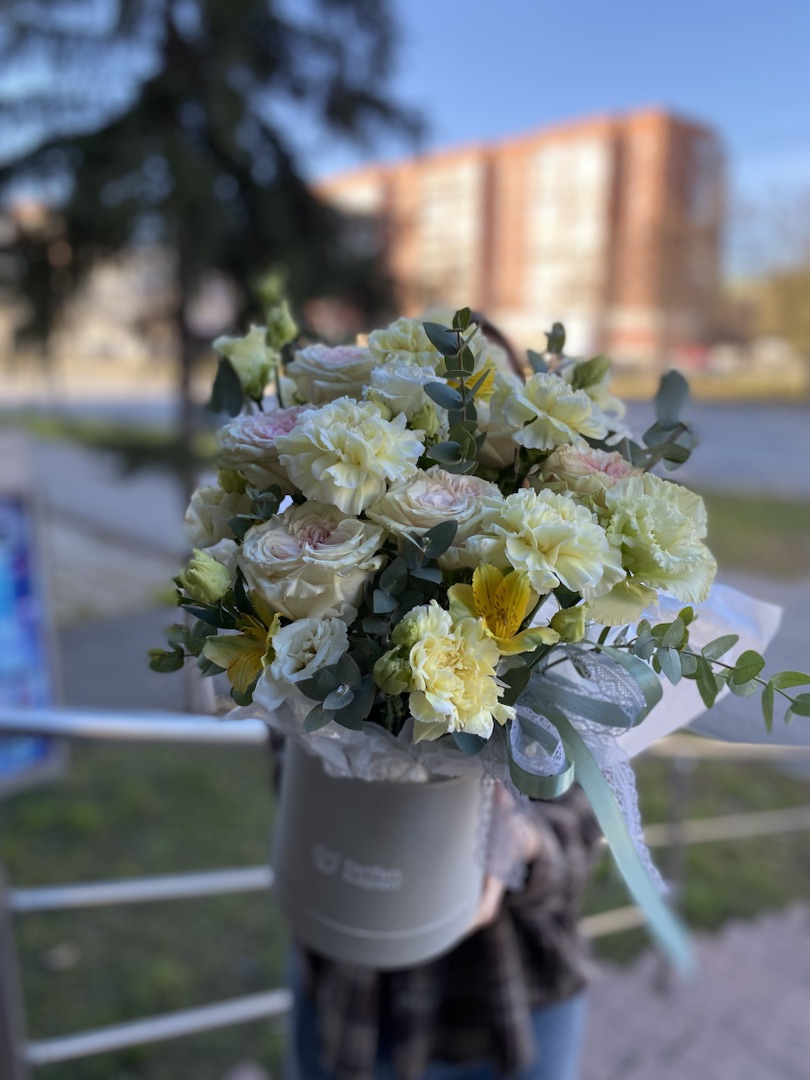 Данная цветочная композиция под запрос. Это значит что возможно у нас отсутствует какой-либо цветок в составе букета. Но мы готовы собрать похожую композицию, не чуть не менее красивую чем эта. Вы можете оставить заявку. И мы свяжемся с вами и предложим возможные варианты.