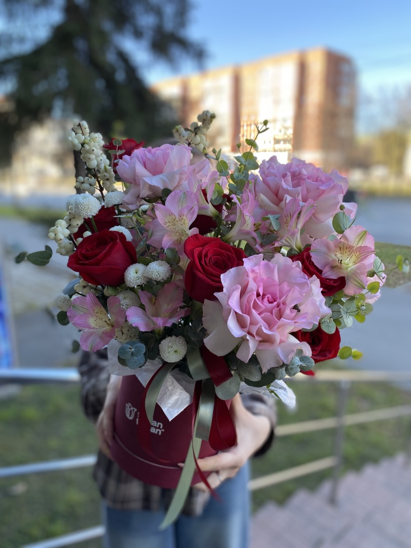 Данная цветочная композиция под запрос. Это значит что возможно у нас отсутствует какой-либо цветок в составе букета. Но мы готовы собрать похожую композицию, не чуть не менее красивую чем эта. Вы можете оставить заявку. И мы свяжемся с вами и предложим возможные варианты.