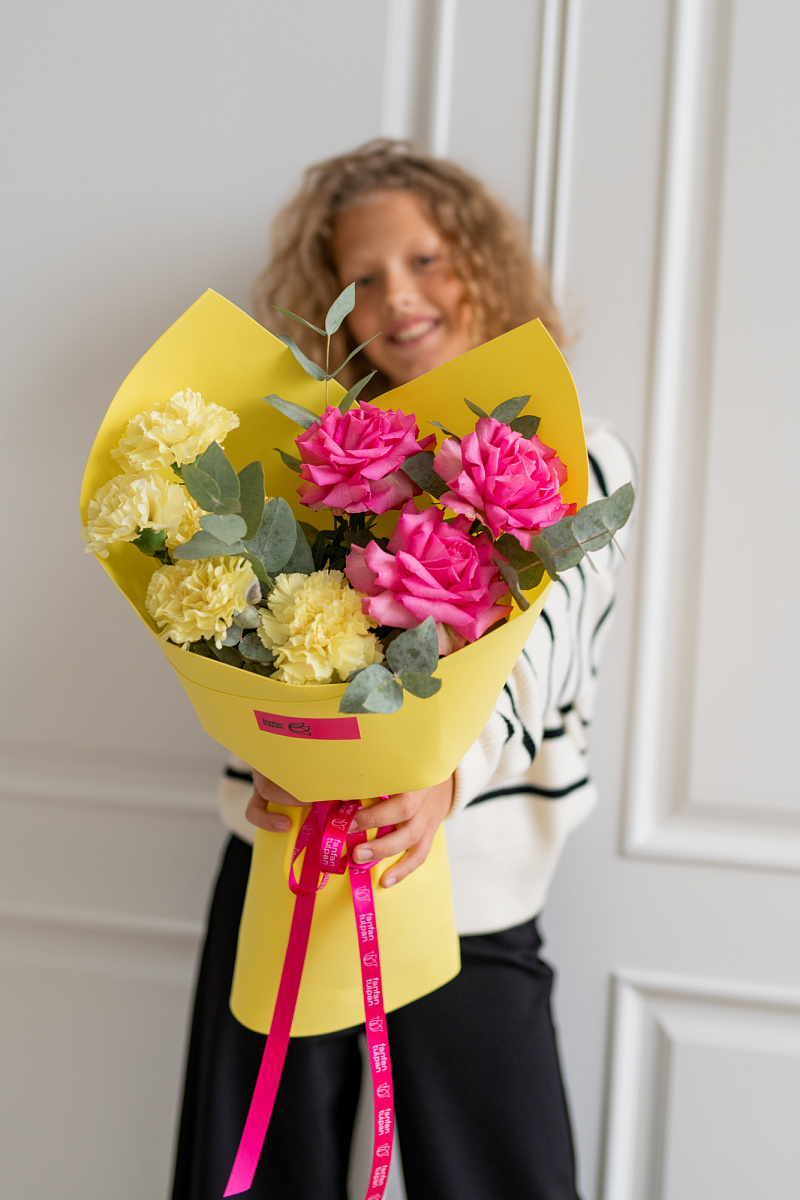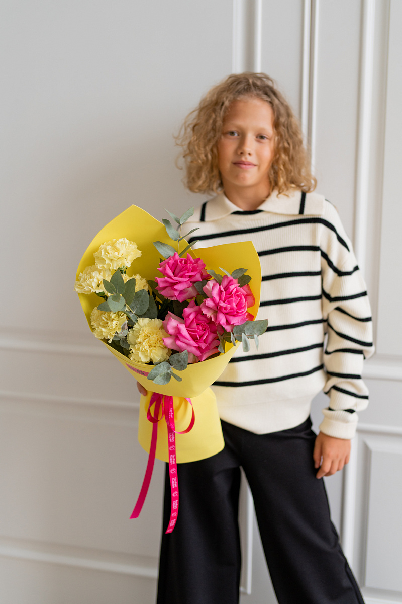 В нежном букете, собранном с любовью, переплетаются яркие желтые гвоздики и утонченные розовые розы. Каждая деталь этого сочетания говорит о гармонии, о радости и о тепле, наполняя пространство светом и свежестью. Желтые гвоздики, с их ярким, солнечным оттенком, символизируют дружбу и счастье, их округлые лепестки словно притягивают взгляды и наполняют душу оптимизмом.