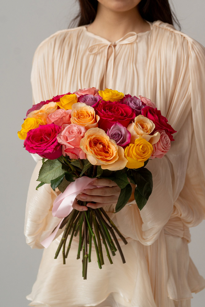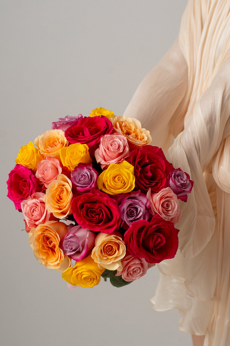 Наш микс роз - это уникальная композиция, собранная из свежих и ароматных Эквадорских роз. Каждая роза в букете имеет свой неповторимый оттенок и форму, что делает его идеальным выбором для любого случая.
