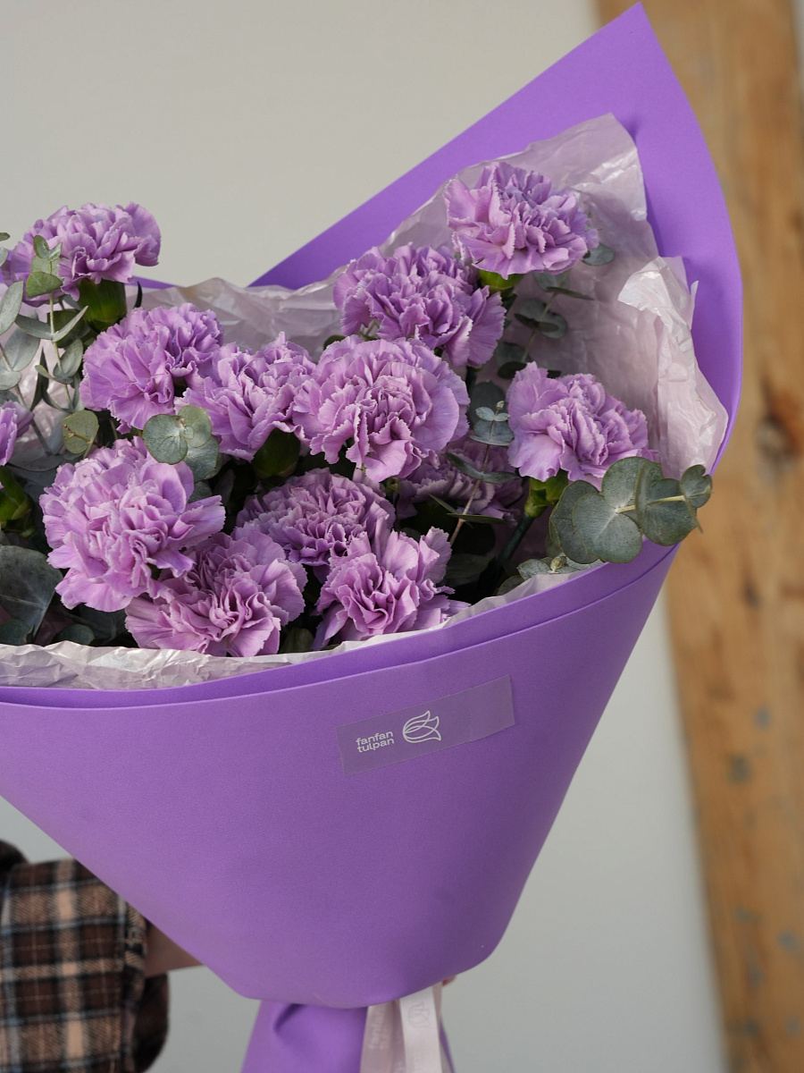 Букет из сиреневых гвоздик выглядит элегантно и изысканно. Сиреневый цвет символизирует утонченность, нежность и романтику.