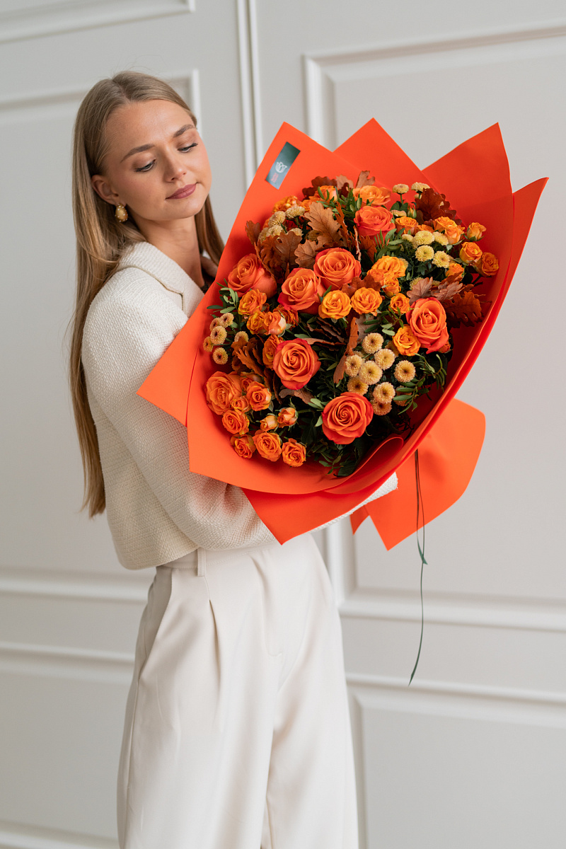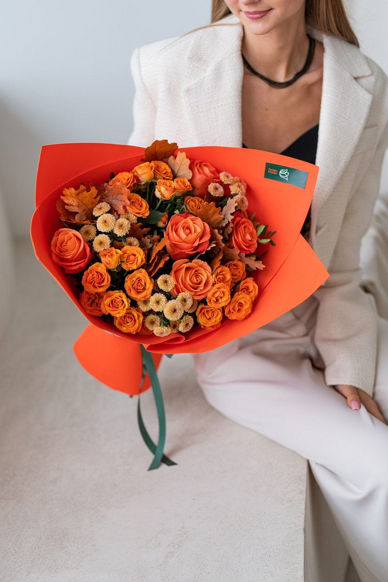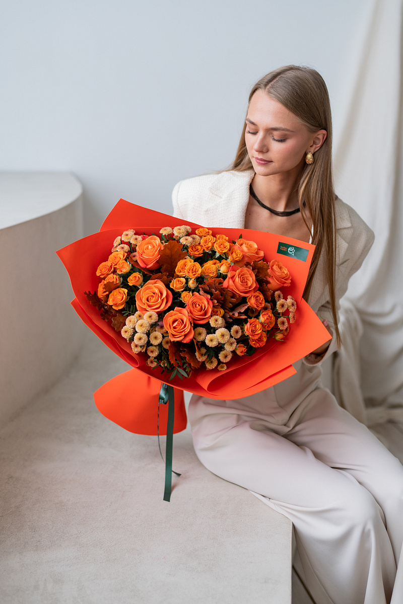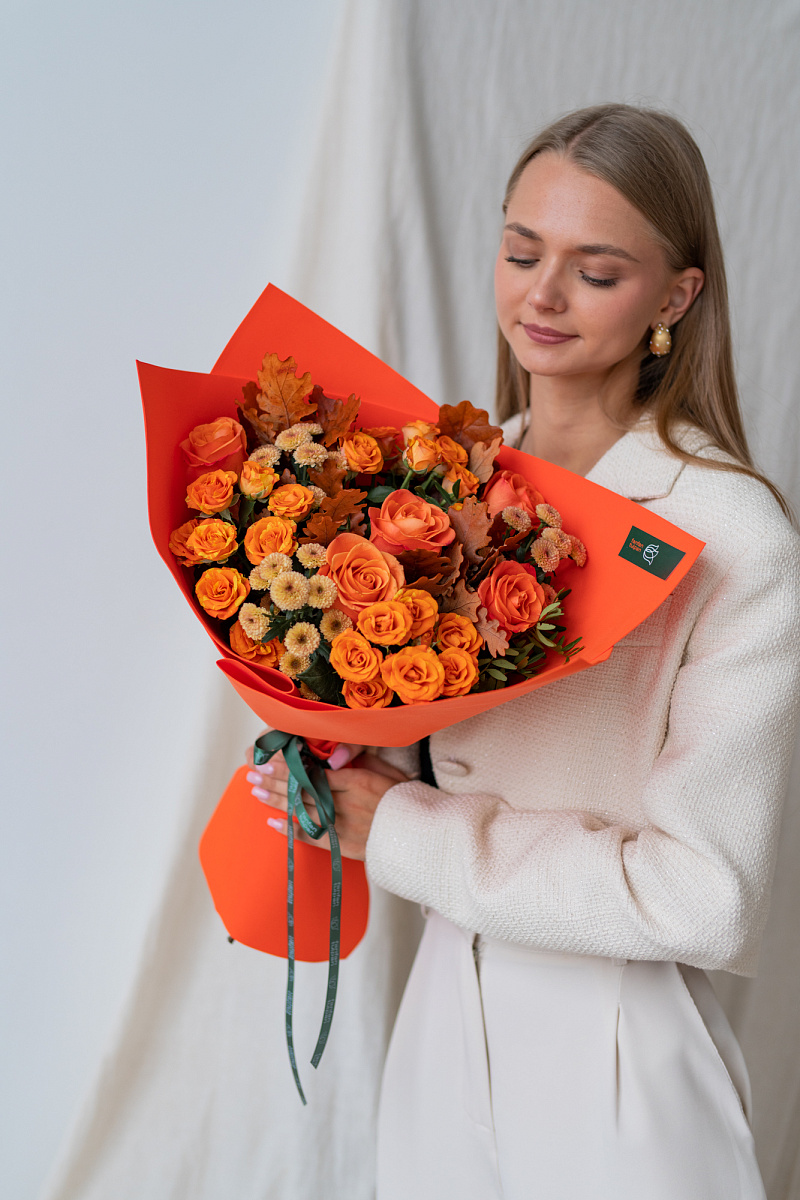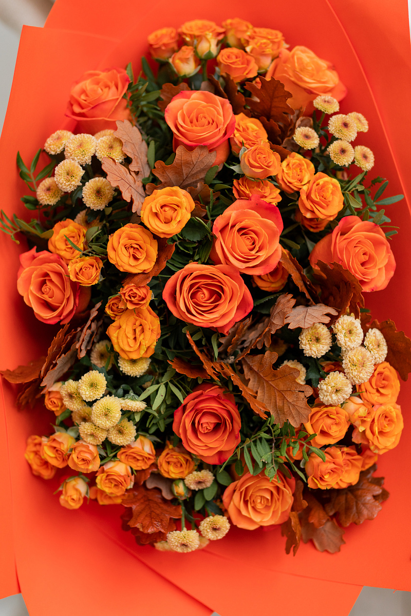 Яркий букет, в котором компактно расположены оранжевые розы, словно солнечные лучи, искрящиеся в мягком свете. Их лепестки, насыщенные и бархатистые, переливаются в солнечном свете, создавая прекрасное зрелище. Вокруг, как выразительная рамка для этой великолепной картины, раскинулись листья дуба, с золотисто-коричневыми оттенками, которые придают композиции настоящую осеннюю харизму.