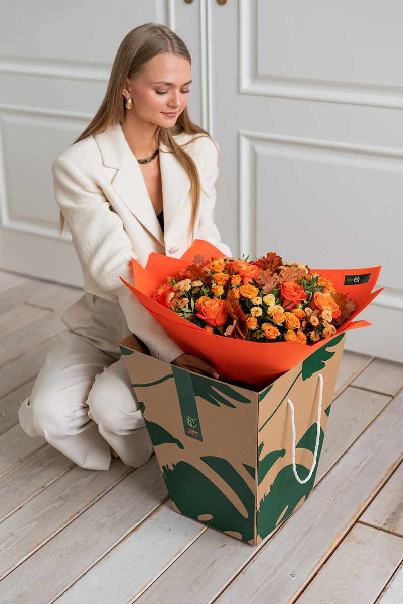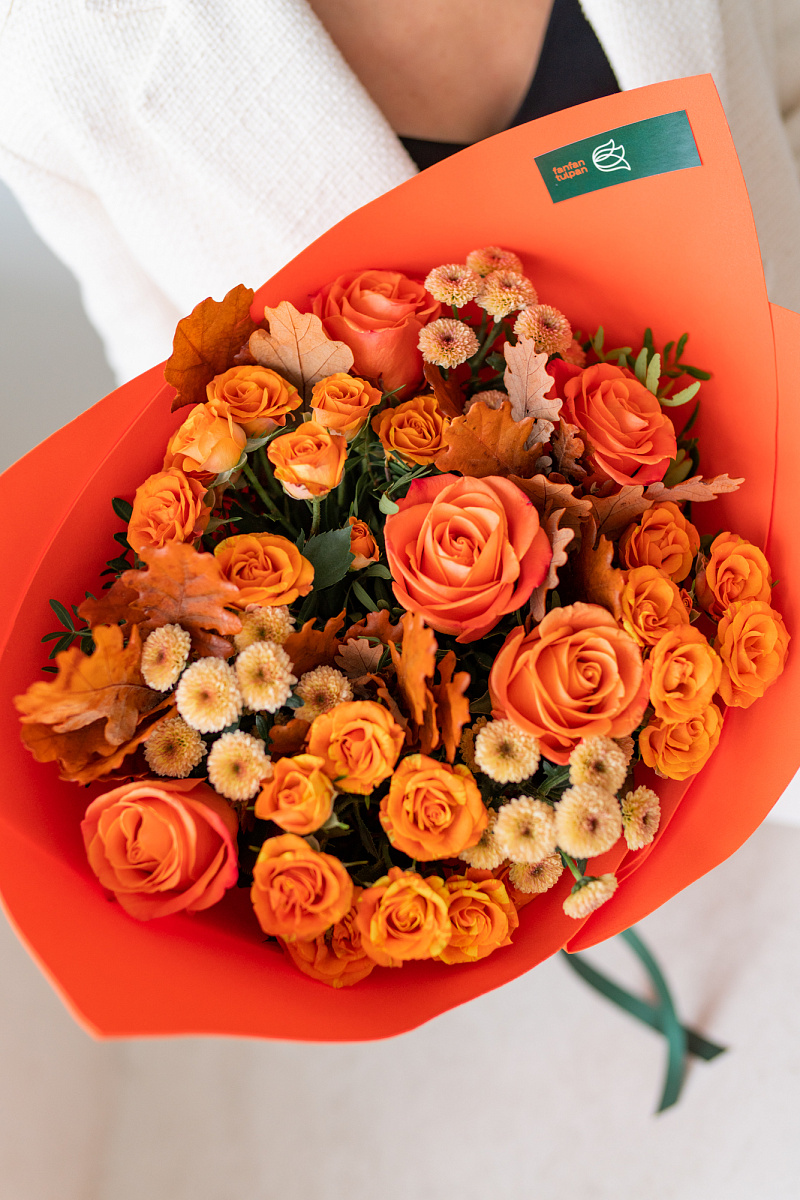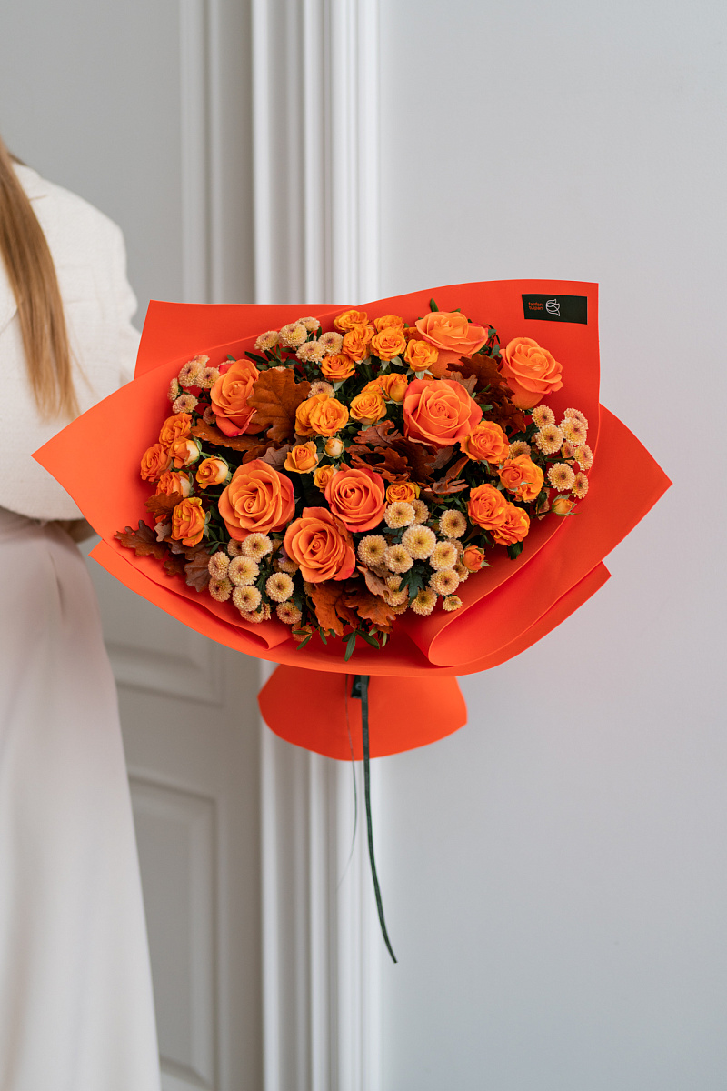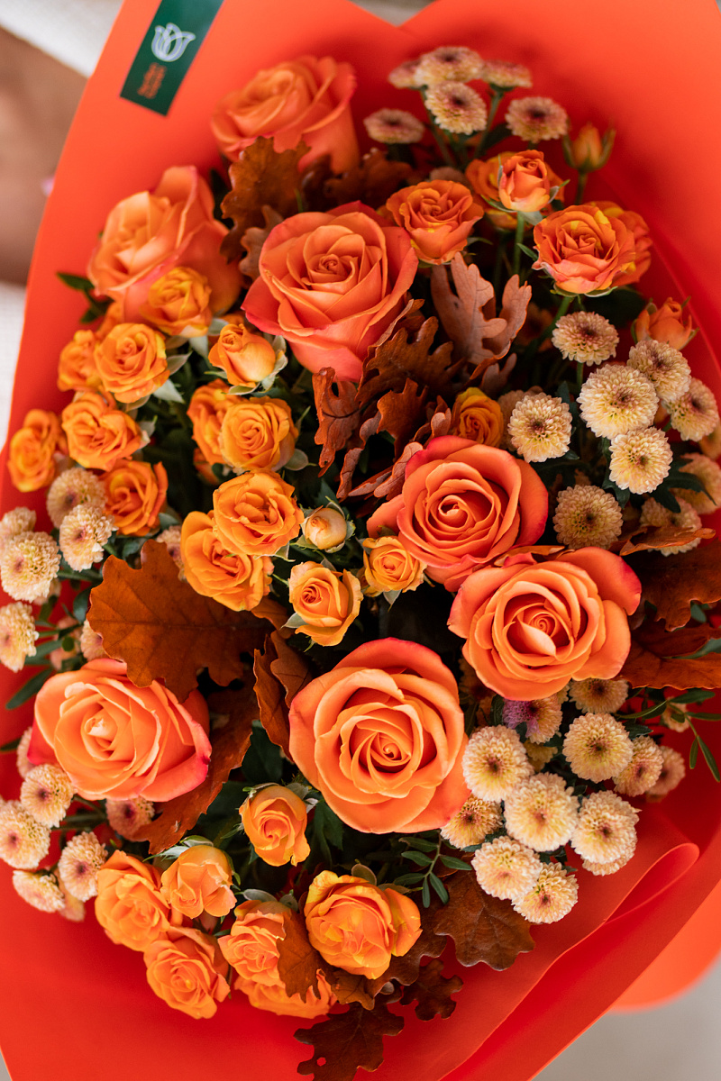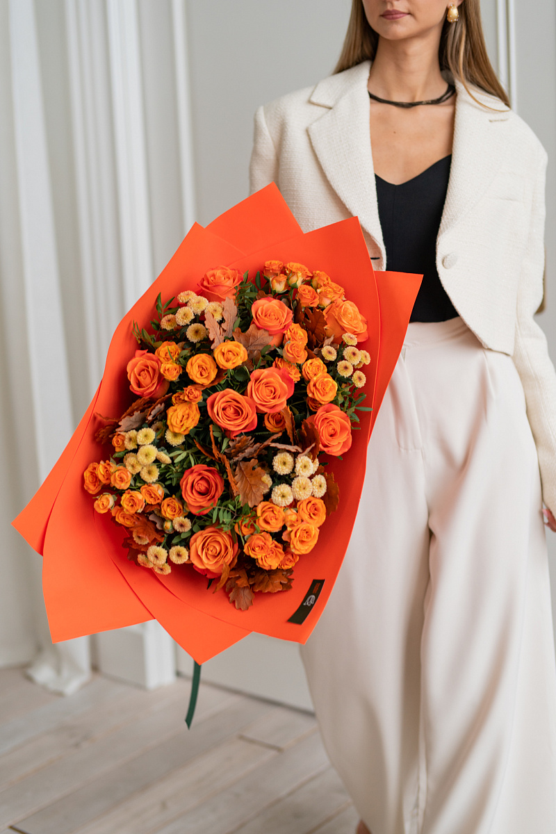 Яркий букет, в котором компактно расположены оранжевые розы, словно солнечные лучи, искрящиеся в мягком свете. Их лепестки, насыщенные и бархатистые, переливаются в солнечном свете, создавая прекрасное зрелище. Вокруг, как выразительная рамка для этой великолепной картины, раскинулись листья дуба, с золотисто-коричневыми оттенками, которые придают композиции настоящую осеннюю харизму.