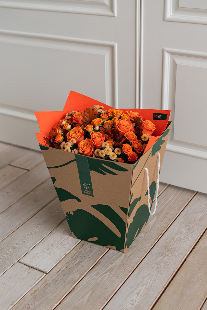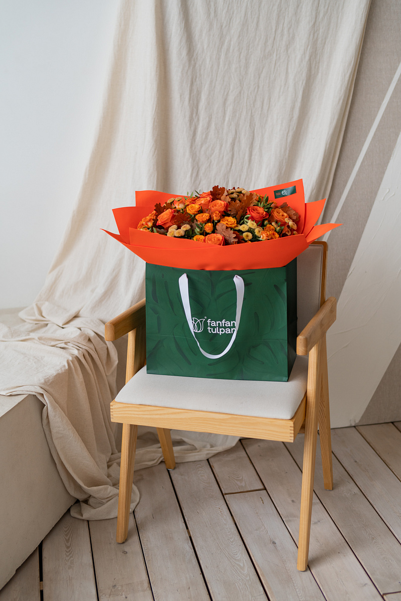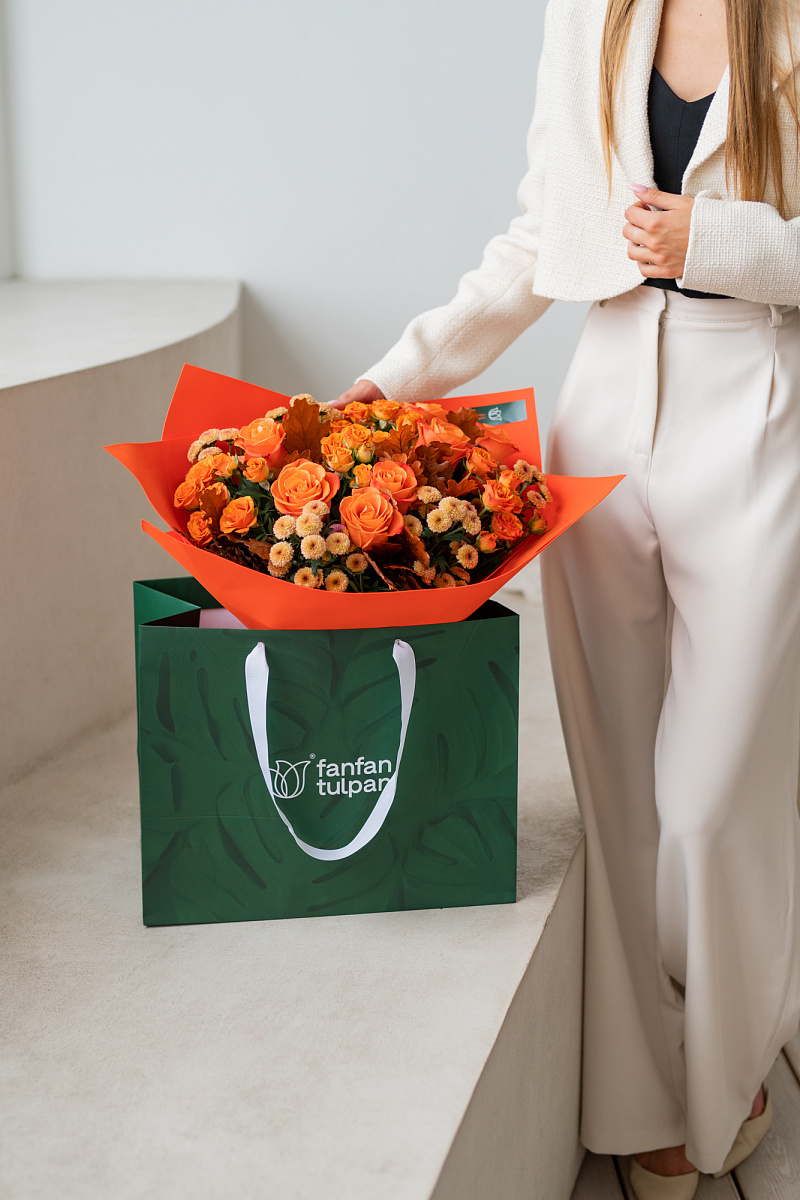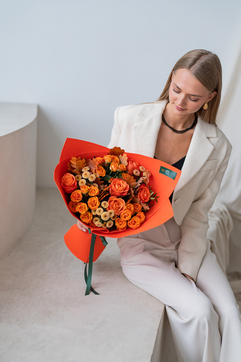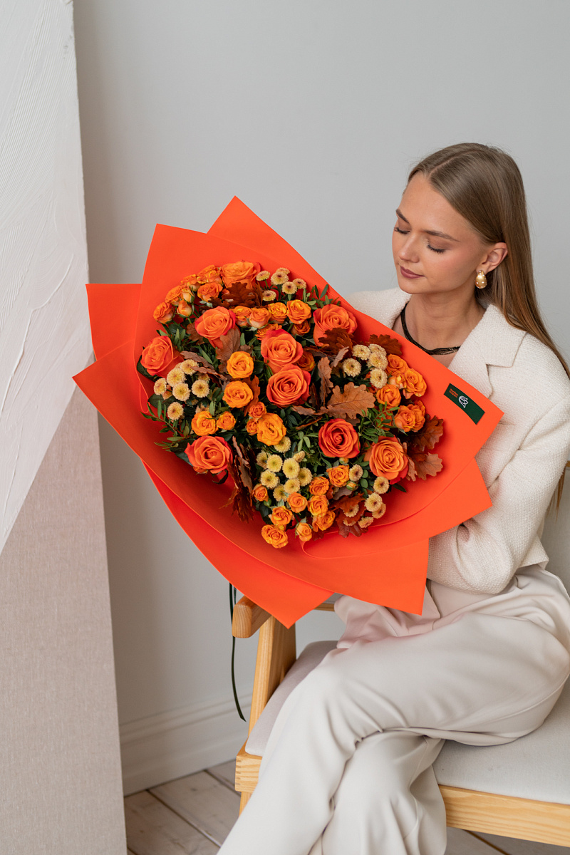 Яркий букет, в котором компактно расположены оранжевые розы, словно солнечные лучи, искрящиеся в мягком свете. Их лепестки, насыщенные и бархатистые, переливаются в солнечном свете, создавая прекрасное зрелище. Вокруг, как выразительная рамка для этой великолепной картины, раскинулись листья дуба, с золотисто-коричневыми оттенками, которые придают композиции настоящую осеннюю харизму.