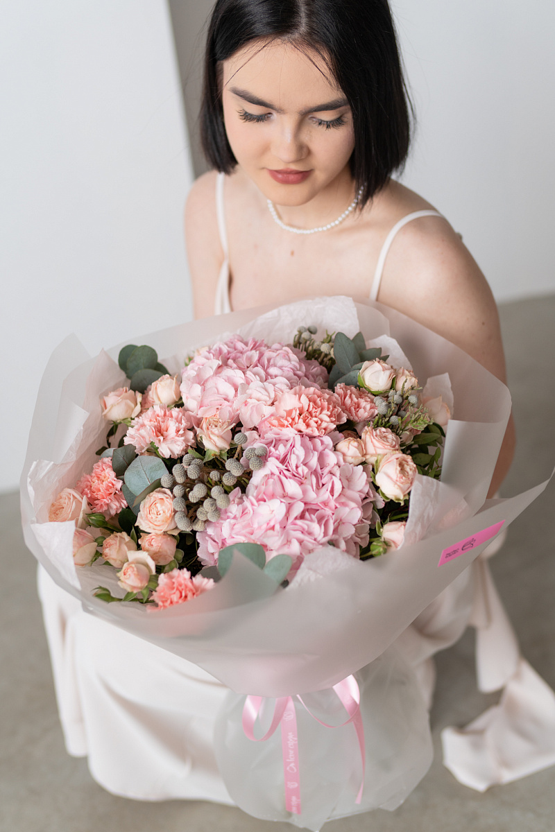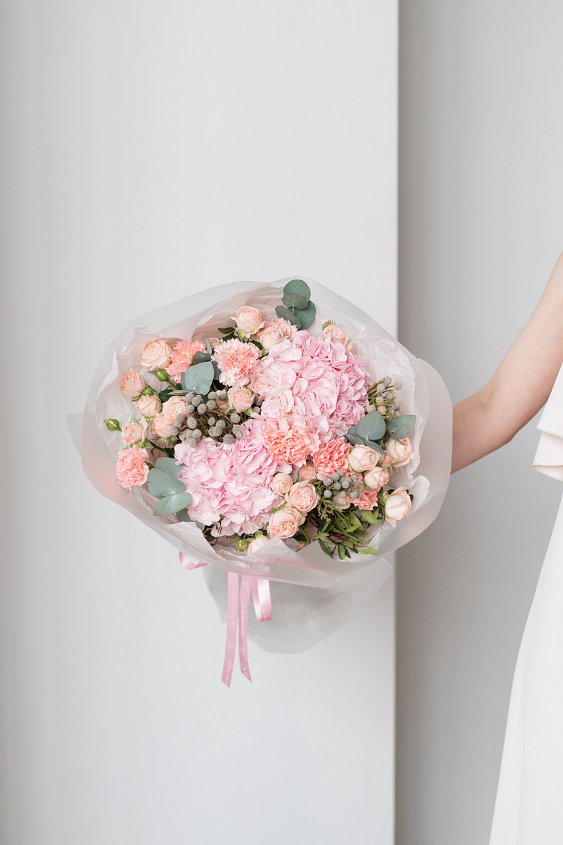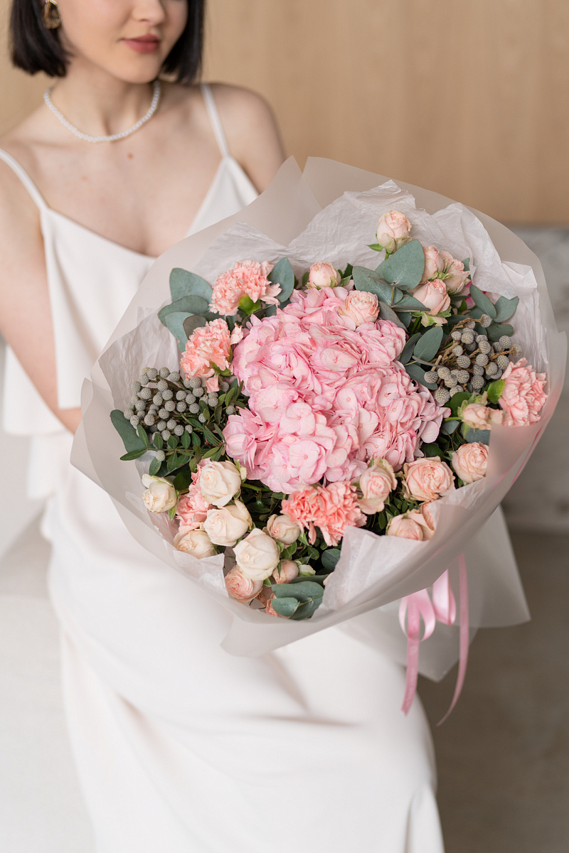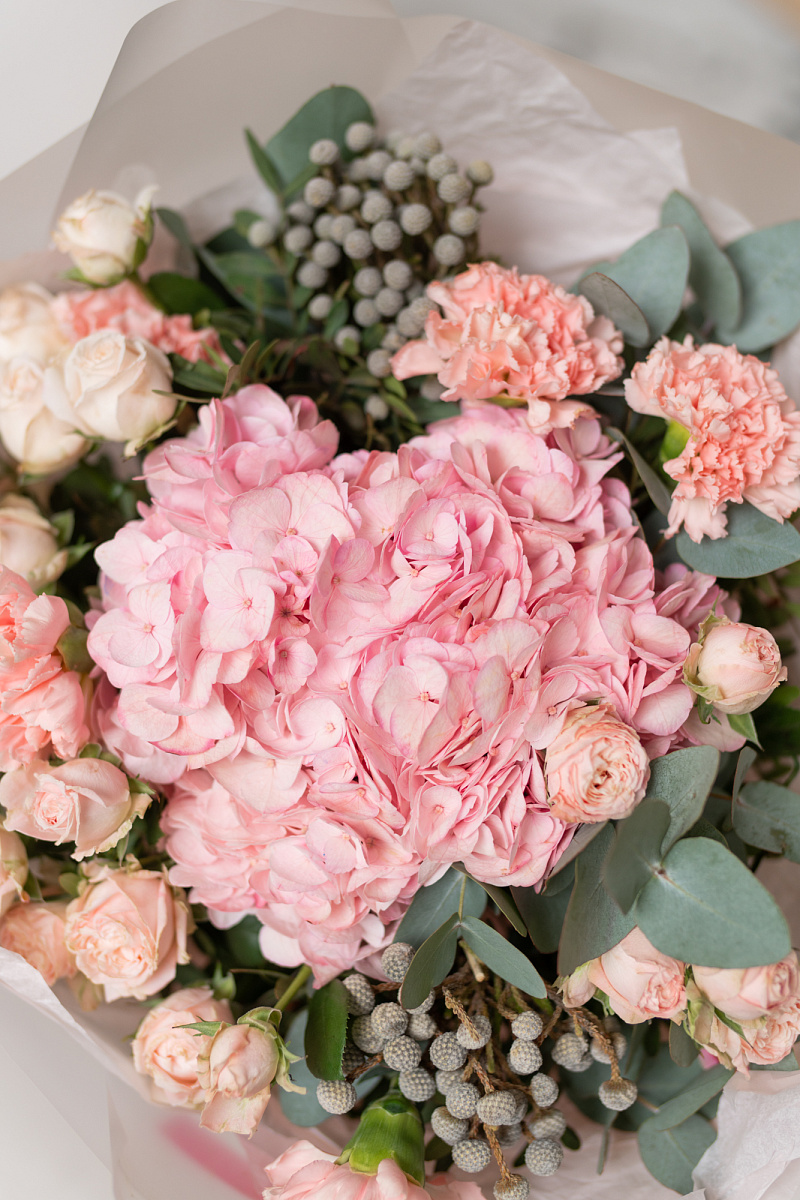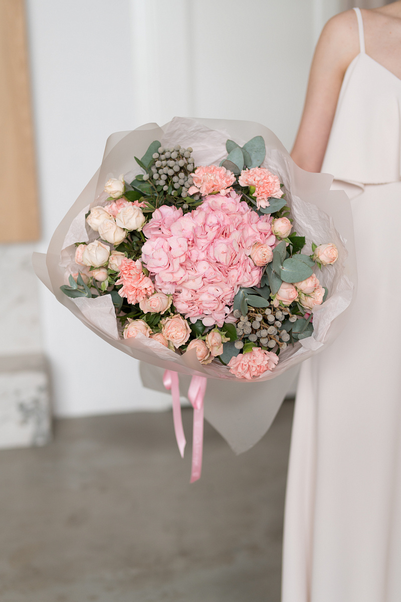 При выборе подарка мы всегда стремимся выбрать что-то особенное, что запомнится на долгие годы. Одним из таких вариантов является букет из гортензии, розовых диантусов, кустовой розы и брунии.