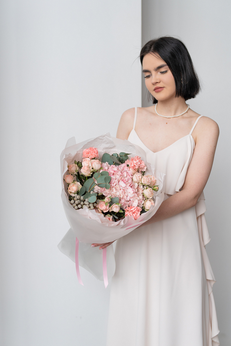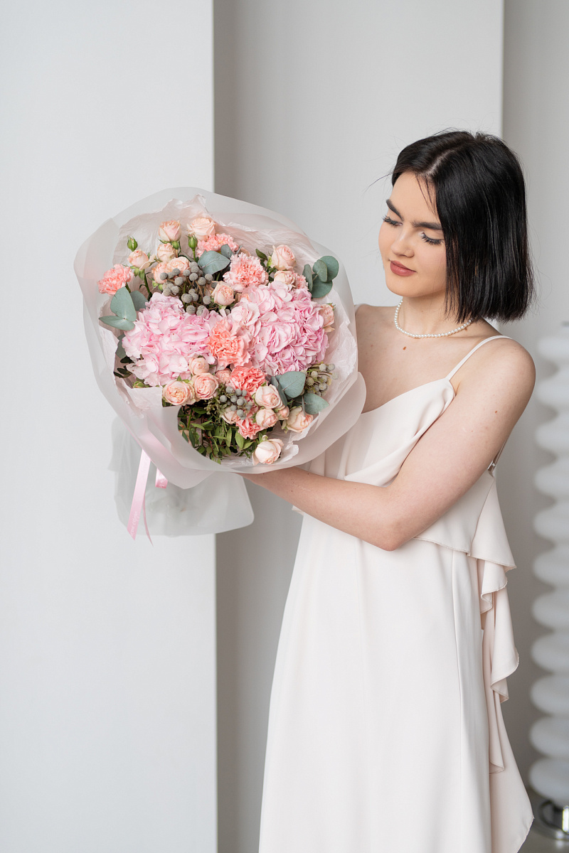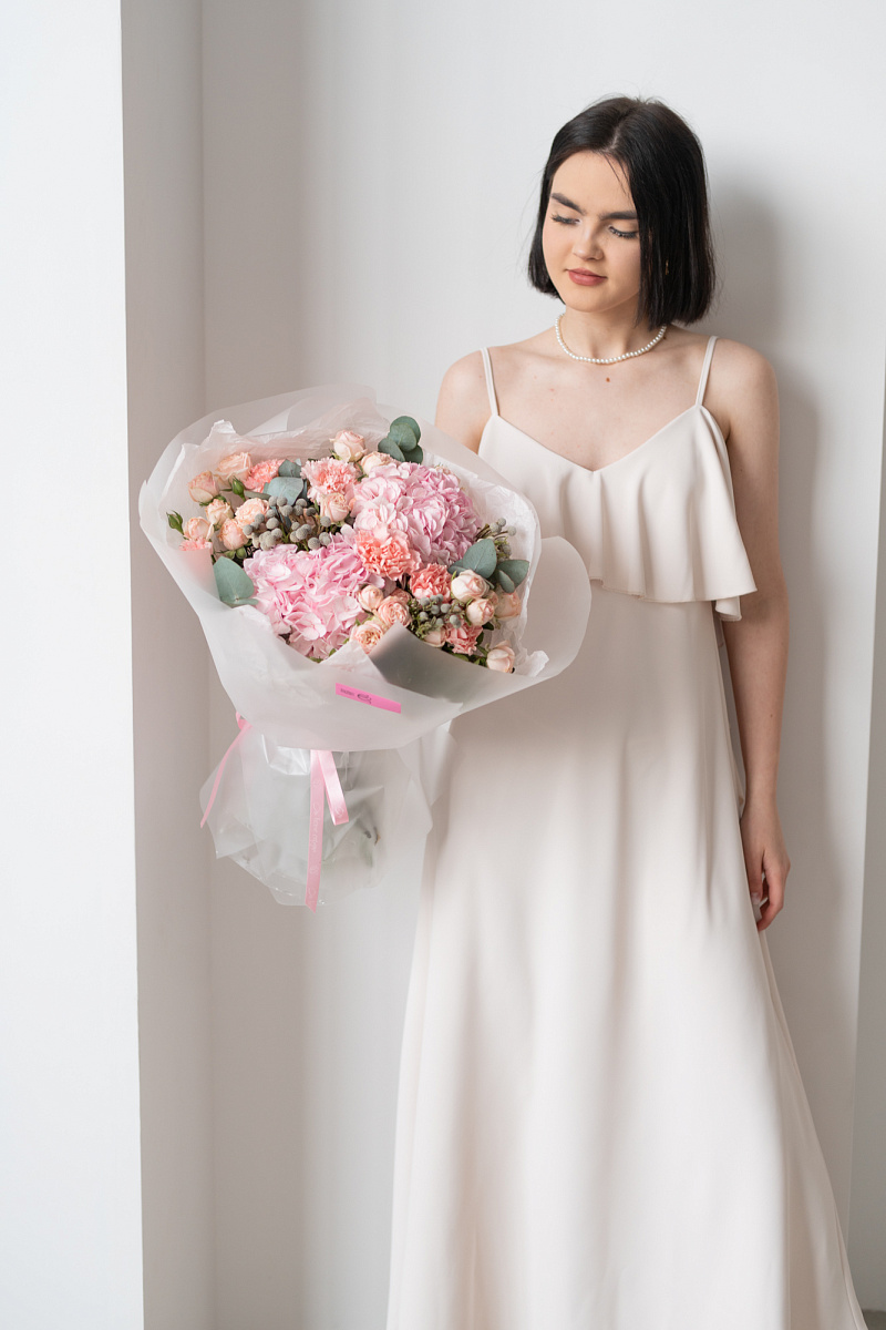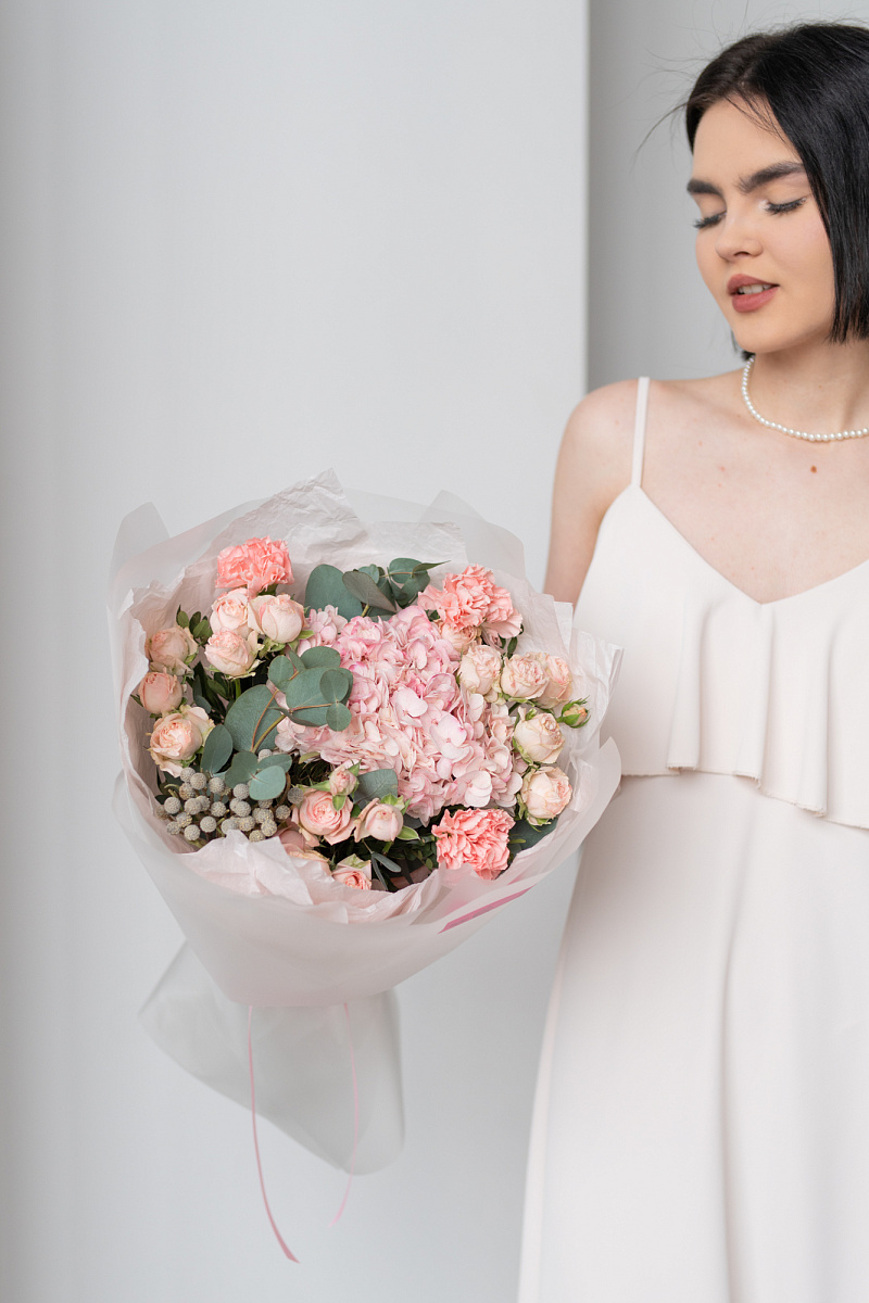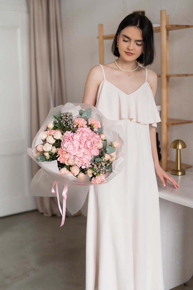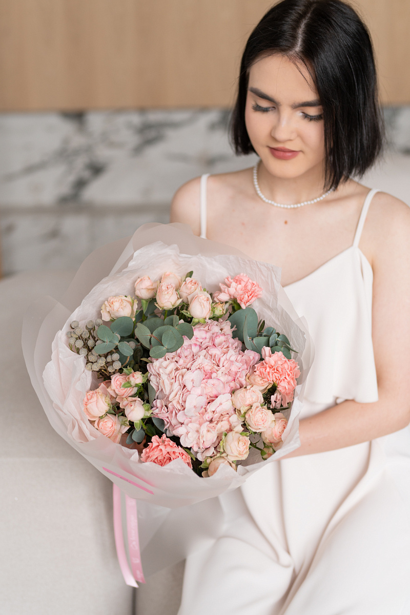 При выборе подарка мы всегда стремимся выбрать что-то особенное, что запомнится на долгие годы. Одним из таких вариантов является букет из гортензии, розовых диантусов, кустовой розы и брунии.