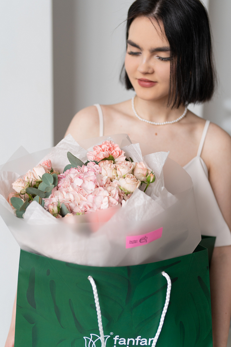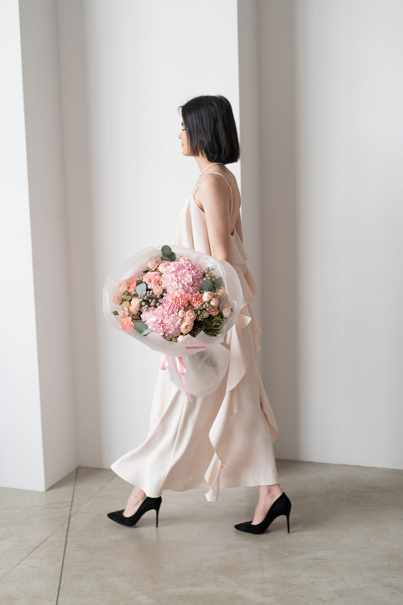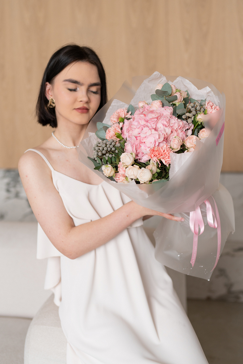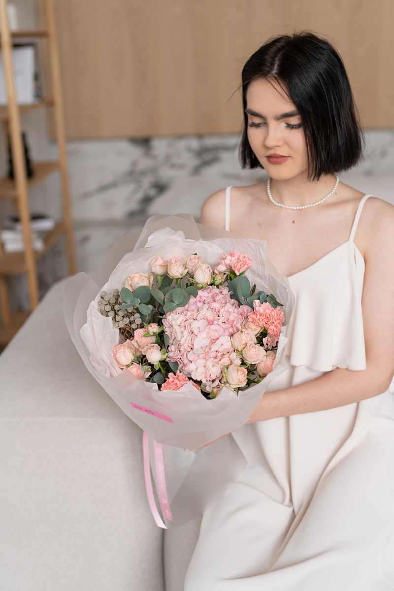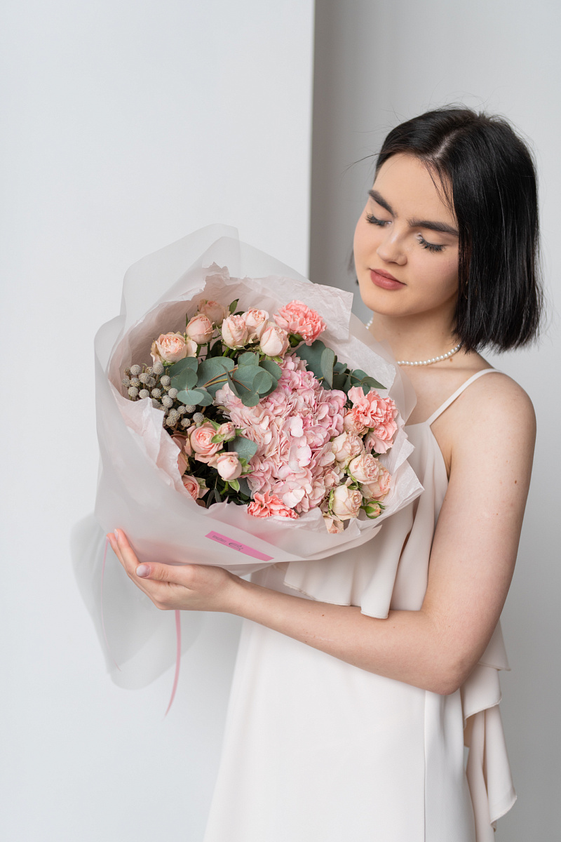 При выборе подарка мы всегда стремимся выбрать что-то особенное, что запомнится на долгие годы. Одним из таких вариантов является букет из гортензии, розовых диантусов, кустовой розы и брунии.
