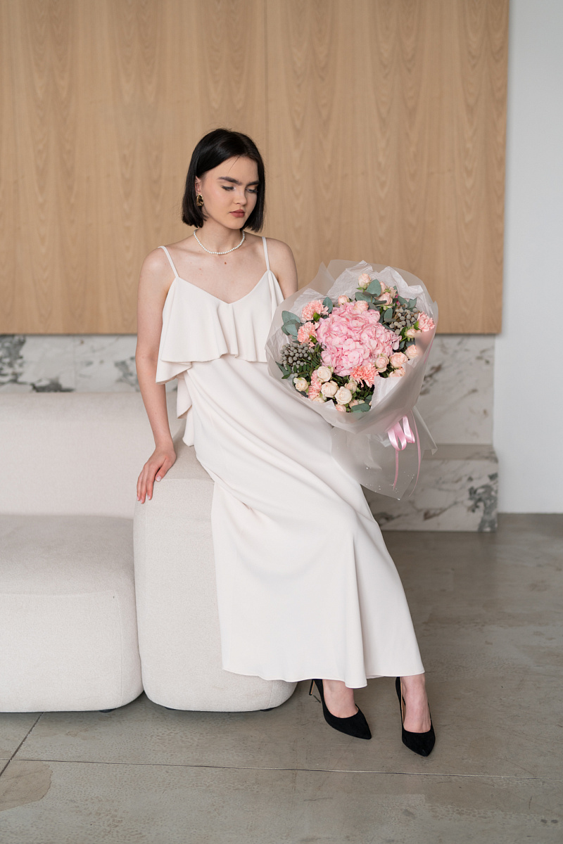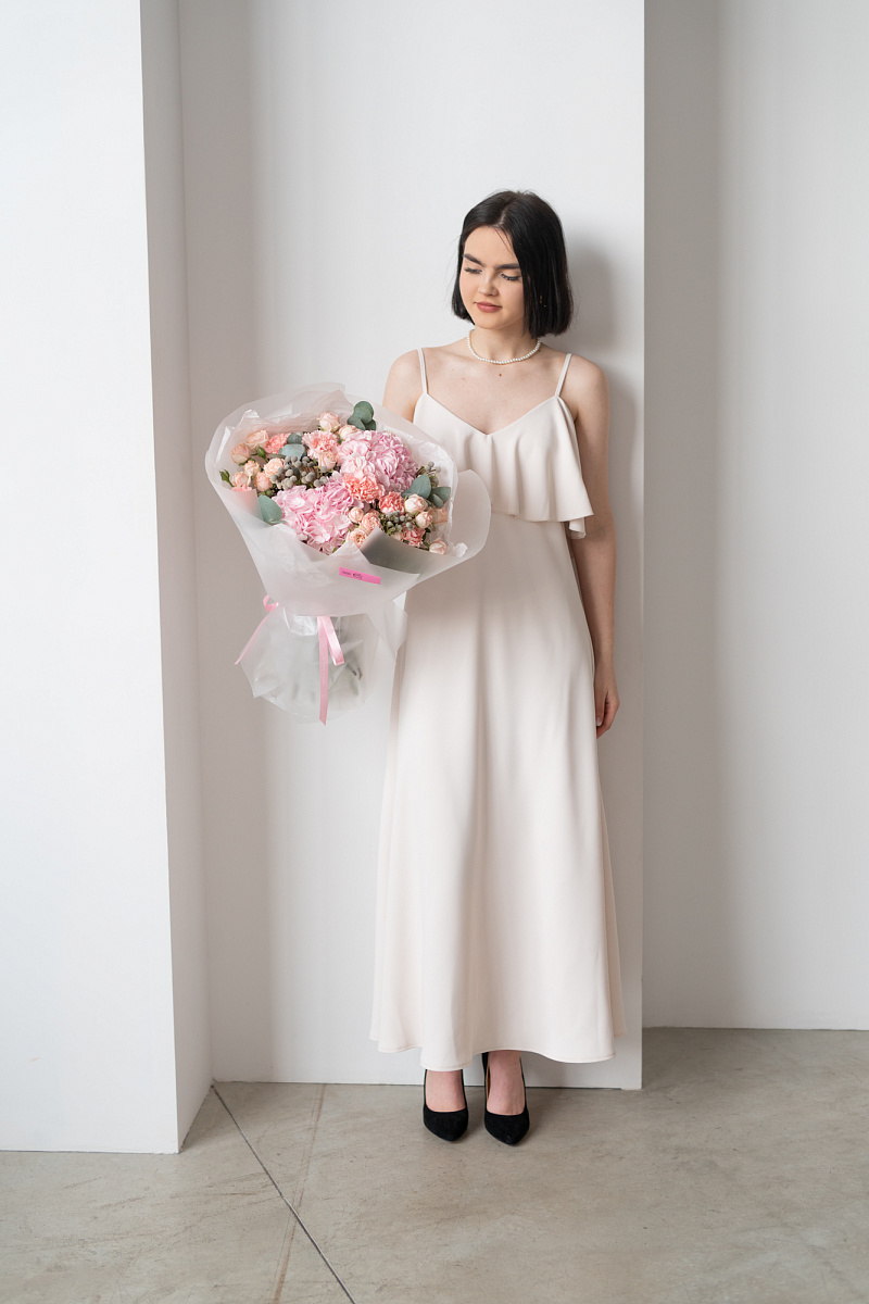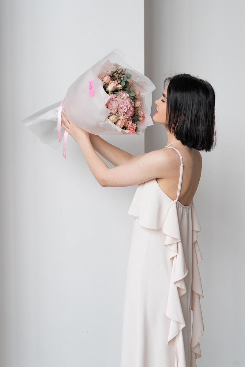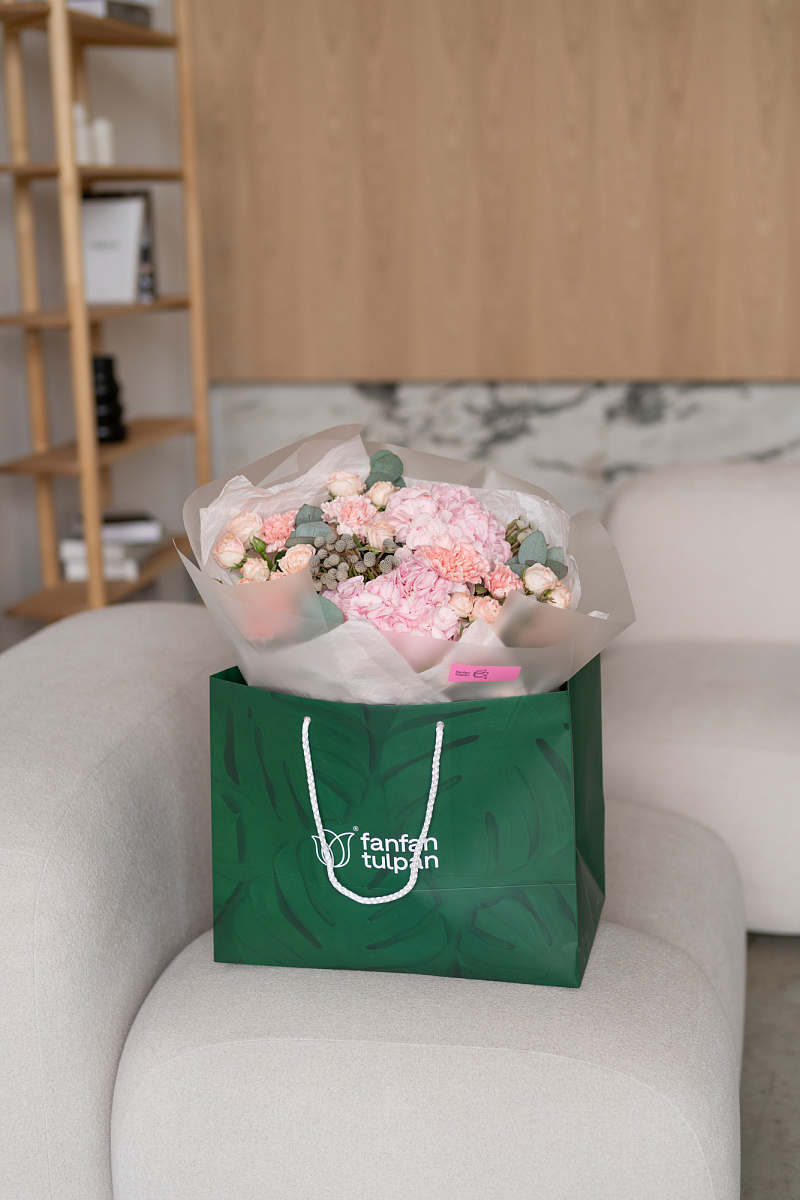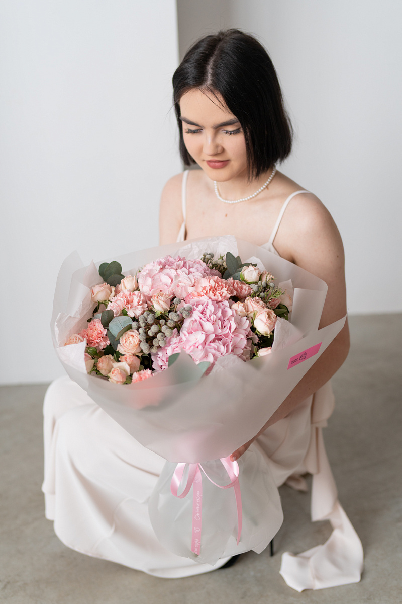 Гортензия обладает невероятной нежностью и красотой, способна украсить любой букет и придать ему особый шарм. Диантусы давно ассоциируются с преданностью и стойкостью чувств, а их нежный розовый оттенок добавляет букету нотку романтики. Серебристая бруния, станет изюминкой в букете и придаст эффект эксклюзивности.