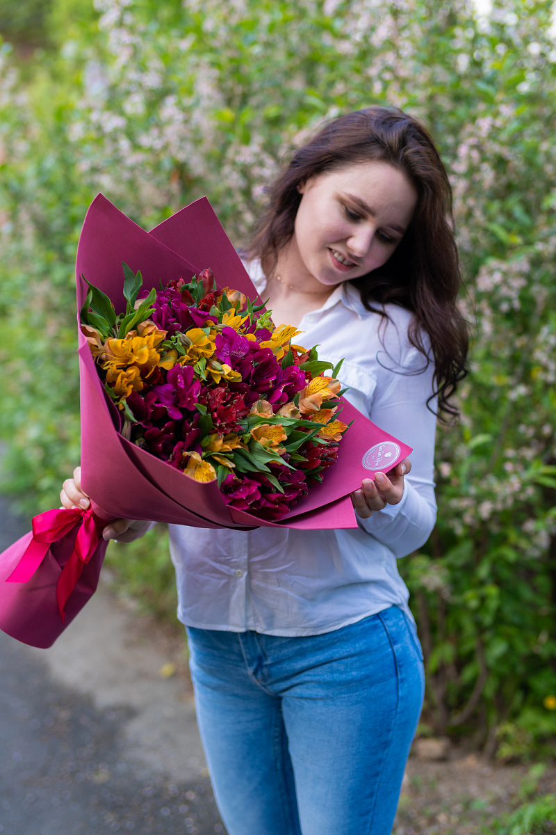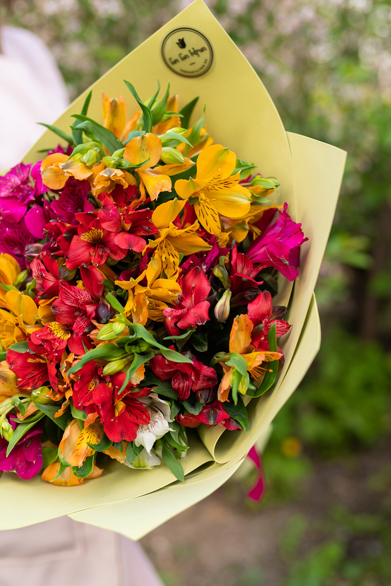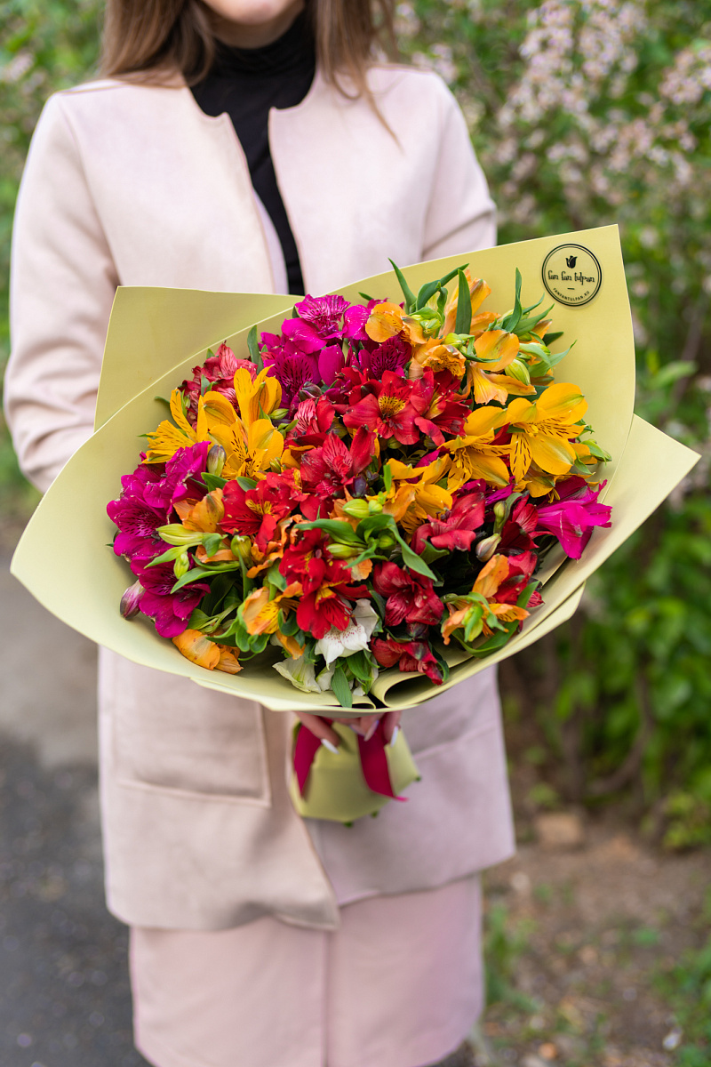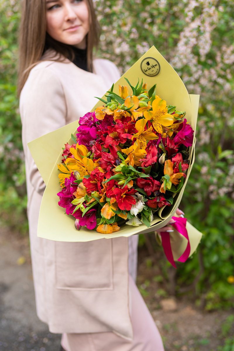 Каждый цветок этого букета выглядит по-своему прекрасно и уникально. Его лепестки, тонкие и изящные, словно созданы, чтобы демонстрировать неповторимую красоту и элегантность. Они притягивают взгляд своей симметрией и гармонией формы. И даже особая текстура лепестков добавляет этому букету неповторимости и уникальности. Каждый цветок этого букета дополняет друг друга, создавая удивительную симфонию красок.Букет из разноцветных альстромерий может выражать различные эмоции и чувства. Он может быть символом любви, идеальным подарком на день рождения или юбилей. Альстромерии, благодаря своей нежности и изысканности, подчеркивают важность момента и создают особую атмосферу праздника.