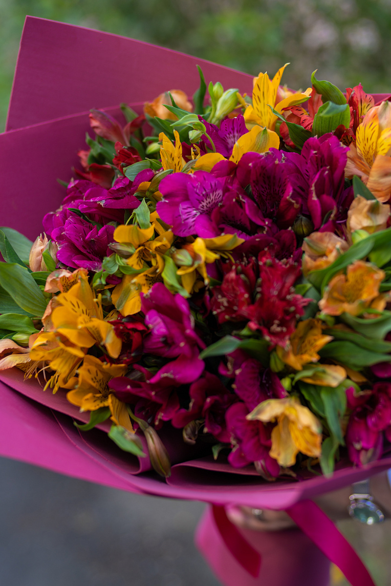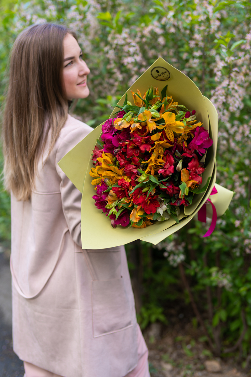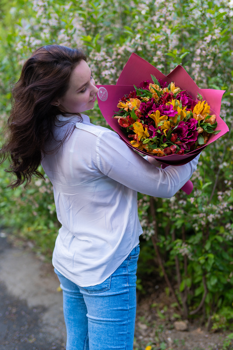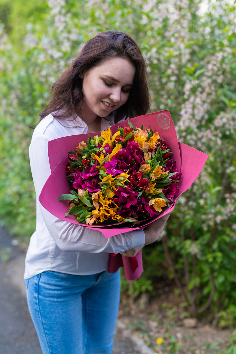 Каждый цветок этого букета выглядит по-своему прекрасно и уникально. Его лепестки, тонкие и изящные, словно созданы, чтобы демонстрировать неповторимую красоту и элегантность. Они притягивают взгляд своей симметрией и гармонией формы. И даже особая текстура лепестков добавляет этому букету неповторимости и уникальности. Каждый цветок этого букета дополняет друг друга, создавая удивительную симфонию красок.Букет из разноцветных альстромерий может выражать различные эмоции и чувства. Он может быть символом любви, идеальным подарком на день рождения или юбилей. Альстромерии, благодаря своей нежности и изысканности, подчеркивают важность момента и создают особую атмосферу праздника.