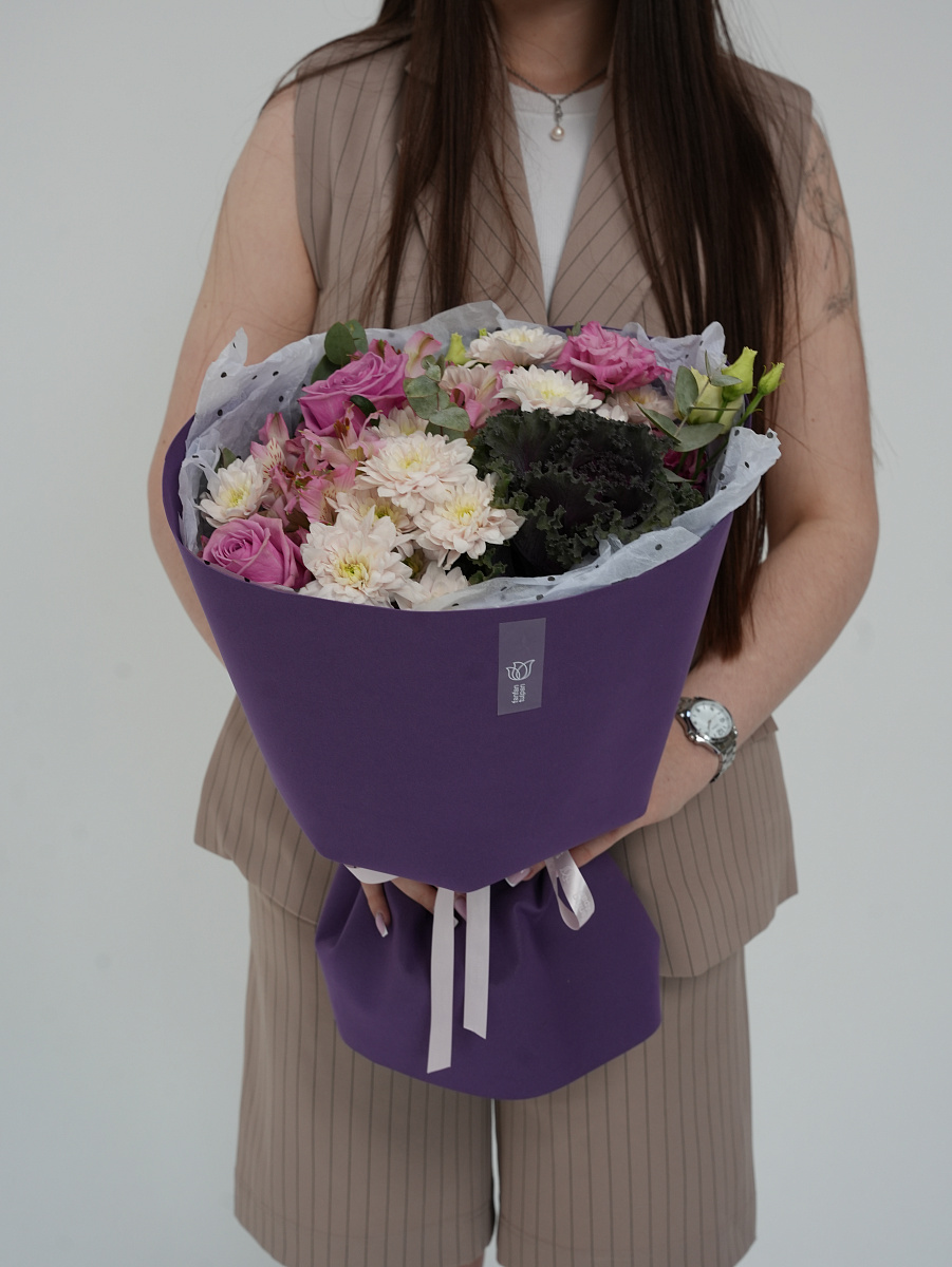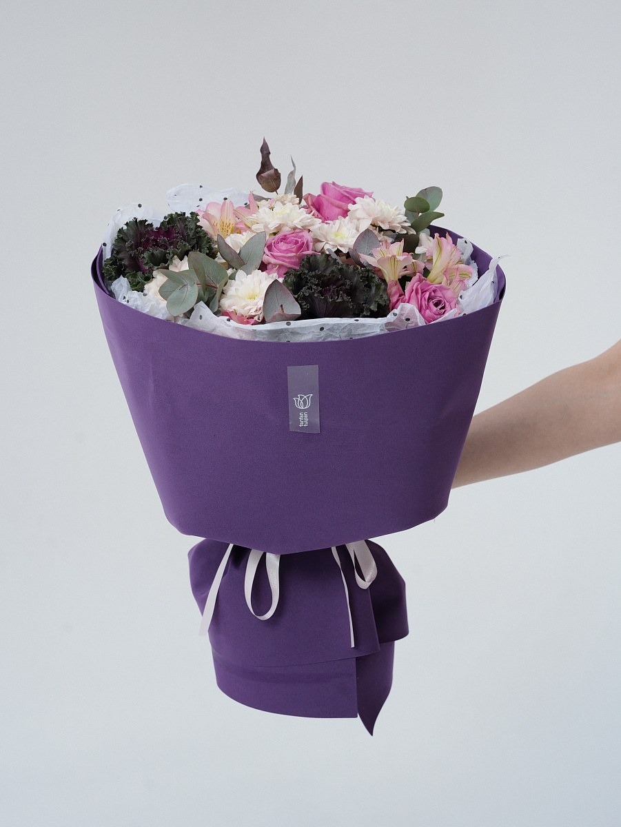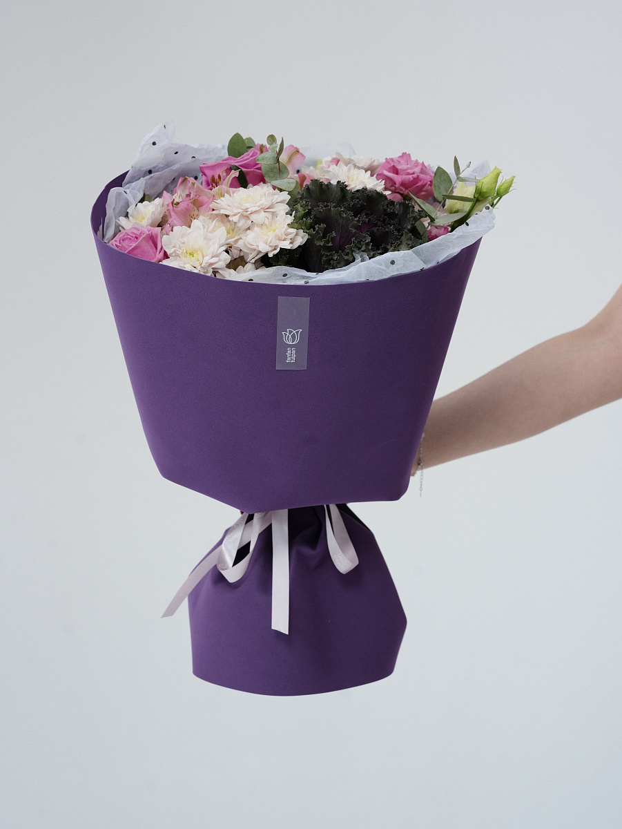 Представленный букет олицетворяет собой соединение природы и искусства. Его основной элемент — капуста брассика, чьи причудливые формы напоминают живописные облака, создаёт контраст и притягивает взгляд.