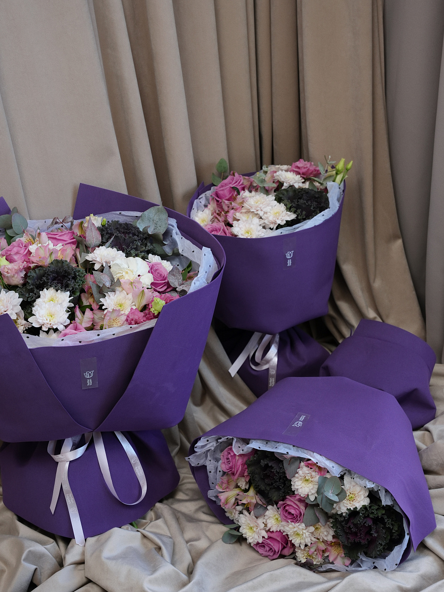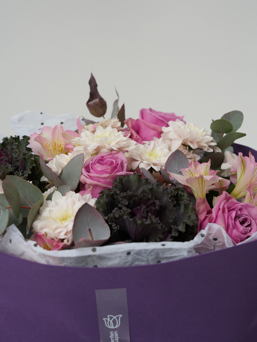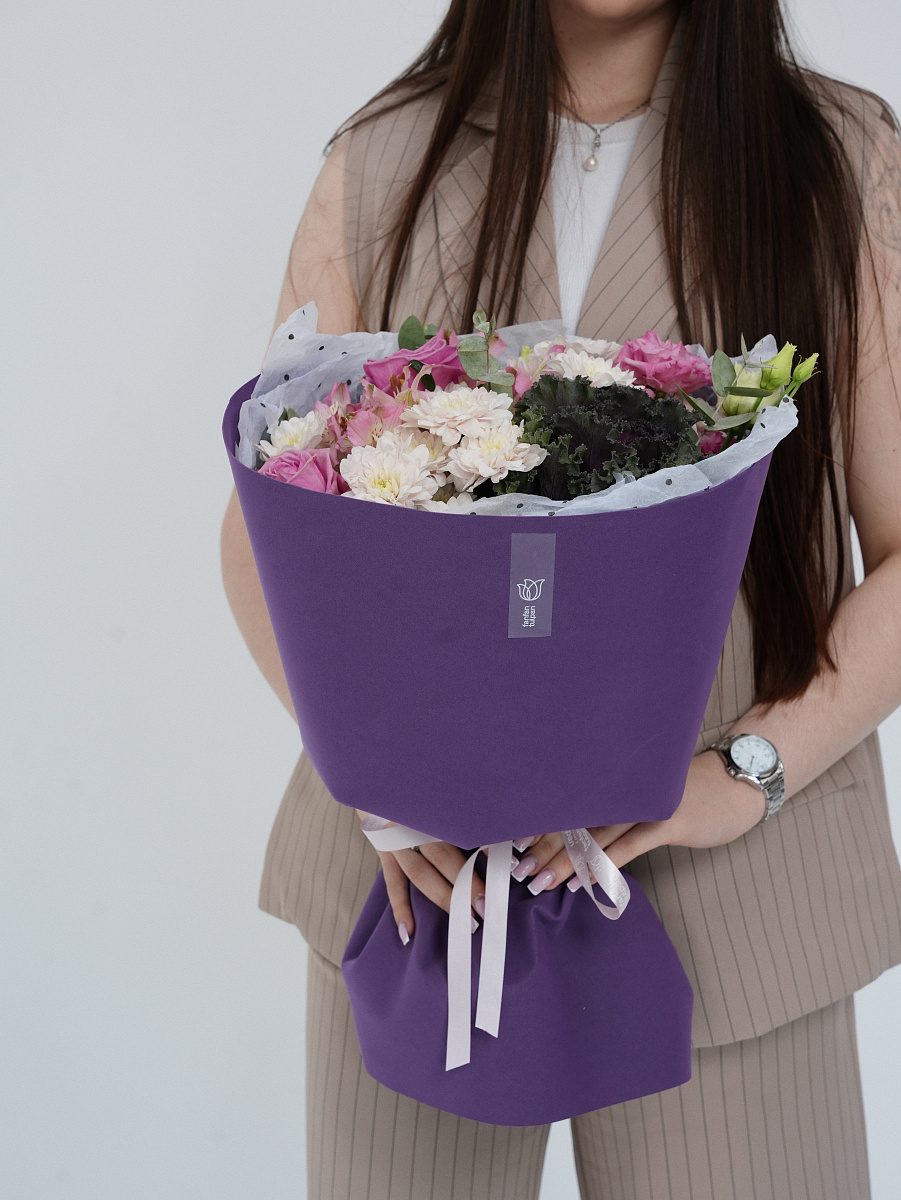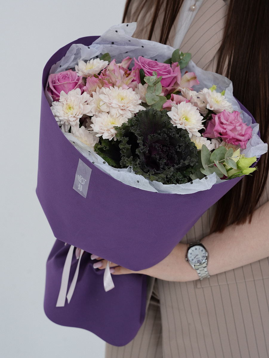 Представленный букет олицетворяет собой соединение природы и искусства. Его основной элемент — капуста брассика, чьи причудливые формы напоминают живописные облака, создаёт контраст и притягивает взгляд.