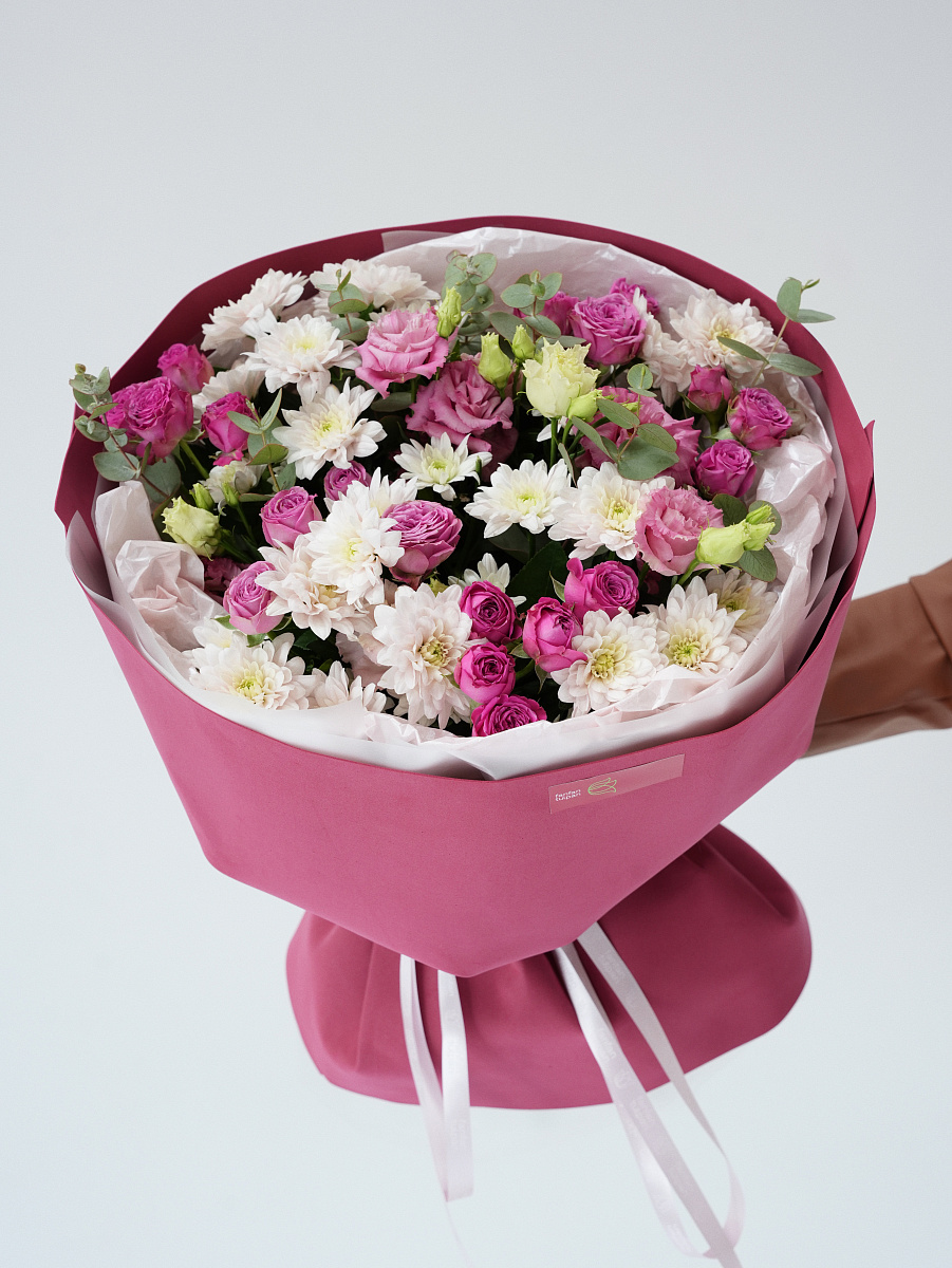 Сборный букет в розово-бордовом цвете — прекрасное сочетание нежности и глубины. Такие оттенки подчеркивают чувственность и тепло чувств.