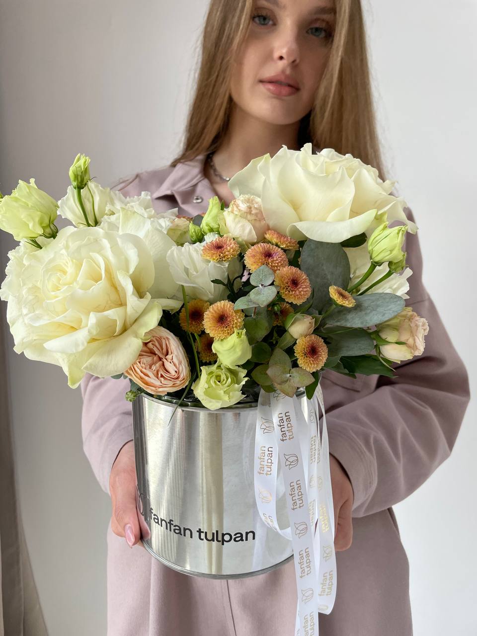 Изящная цветочная композиция с белоснежными розами и нежными кремовыми сантини воплощает в себе тонкую игру света и тени, отражающую всю прелесть осенней поры.