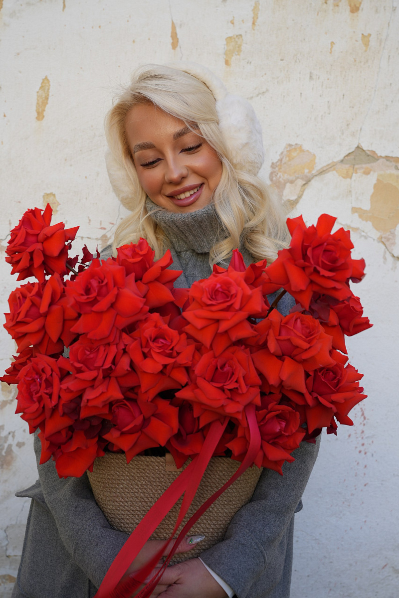 Этот страстный шедевр состоит из 25 свежих алых роз сорта Nina с бархатистыми лепестками и насыщенным ароматом, мастерски уложенных в элегантную корзину.
